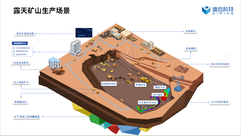 面對礦業高質量發展的新要求,迪邁科技堅持以技術創新為核心,圍繞礦山生產全生命周期,構建了覆蓋“資源掌握—安全生產—無人作業—智慧運營”的完整產品與技術體系,為露天礦與地下礦提供一體化、場景化、可落地的整體解決方案。在資源協同、生產調度、智能無人開采、安全管控等關鍵領域,已形成成熟技術路線和豐富工程經驗,并在多座大型礦山實現規模化應用,顯著提升礦山本質安全水平和整體運營效率。